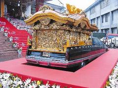 中新網(wǎng)4月15日電 臺灣的一家殯葬業(yè)者日前推出造價3600萬元新臺幣的黃金宮殿靈車,車體是加長型的凱迪拉克,上方的宮殿、雕飾品都覆上金箔,租金一天10萬元。據(jù)說已有金融業(yè)及電子業(yè)名人家屬向業(yè)者詢問,打算為長輩預訂黃金靈車。