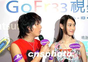 4月17日,香港樂壇Boy’z成員關(guān)智斌及新人Isabella(右)擔(dān)任松日公司MP3代言人。作者:譚達(dá)明