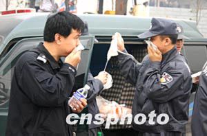 四月十七日,在重慶市天原化工總廠附近待命的警察正在領(lǐng)取口罩。十五日晚,該廠發(fā)生氯氣泄漏事故,有十五萬(wàn)人撤離。作者:鄒輝