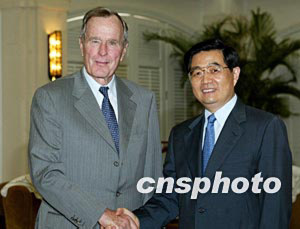 中新社博鰲四月二十三日電(記者 阮煜琳 關(guān)向東 王辛莉)中國國家主席胡錦濤二十三日下午在海南博鰲會(huì)見了前來參加博鰲亞洲論壇二OO四年年會(huì)的美國前總統(tǒng)喬治·布什,并表示,我們愿同美方一道,牢牢把握中美關(guān)系大局,加強(qiáng)交往和合作,妥善處理兩國關(guān)系中的問題,推動(dòng)中美關(guān)系繼續(xù)穩(wěn)定發(fā)展。