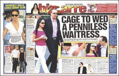 美國(guó)娛樂(lè)雜志《Bizarre》在最新一期中報(bào)道說(shuō):“尼古拉斯·凱奇將和身無(wú)分文的19歲餐廳服務(wù)生愛麗斯·金結(jié)婚。這不是電影,而是活生生的事實(shí)。”
