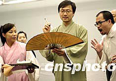 香港話劇團(tuán)2004/05年春夏劇第一炮《桃花扇》,四月二十九日舉行宣傳活動(dòng),該劇將于五月中旬在在香港大會(huì)堂劇院上演,圖為香港話劇團(tuán)藝術(shù)總監(jiān)毛俊輝為該劇造勢(shì)。 作者:錢興強(qiáng)