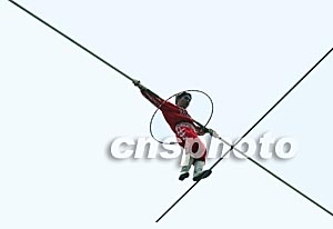 “高空王子”阿迪力唯一傳人沙特爾五月一日起在廣州香江野生動(dòng)物世界挑戰(zhàn)吉尼斯世界紀(jì)錄。這位十五歲的維吾爾族少年將在虎山上空度過二百小時(shí),挑戰(zhàn)生存極限。圖為小伙子在鋼絲上表演呼啦圈。作者:梁永強(qiáng)