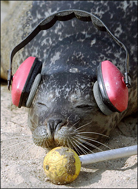 一個正在接受科學(xué)研究的14歲海豹頭戴耳機,樣子憨態(tài)可掬。