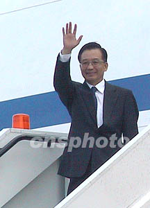 中新社倫敦五月九日電 (記者 朱大強)當?shù)貢r間今天上午十時五十分,中國國務(wù)院總理溫家寶乘專機抵達倫敦希思羅機場,開始對英國進行為期三天的正式訪問。
