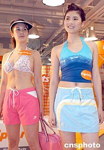 樂(lè)壇新星官恩娜(右)、歌星陳見(jiàn)飛5月12日在香港出席全港最大的運(yùn)動(dòng)專門(mén)店GigaSports SuperStore開(kāi)幕,兩人客串模特展示最新泳裝。