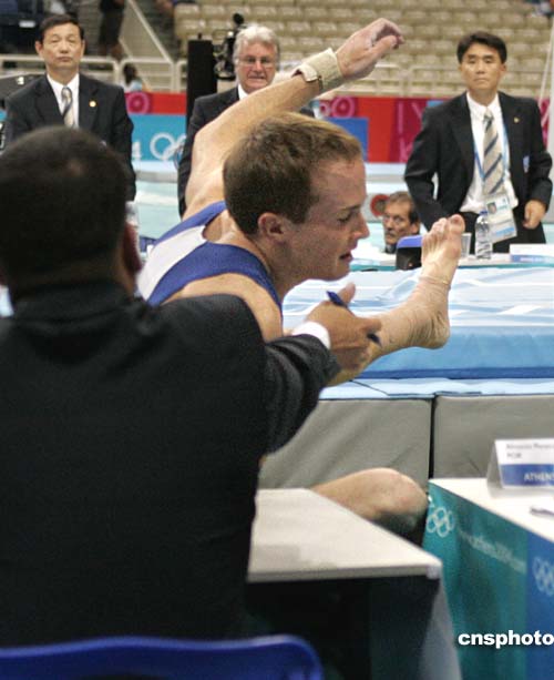 圖為奧運(yùn)會男子體操全能比賽中,美國選手保羅-漢姆在跳馬項(xiàng)目中出現(xiàn)失誤,摔倒在一名裁判腿上。不過,最后他還是拿到了這個項(xiàng)目的冠軍。