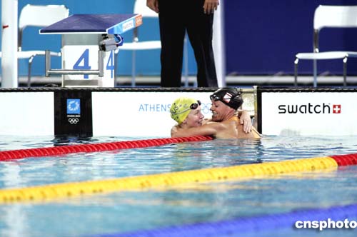 圖為在當(dāng)?shù)貢r間19日舉行的女子自由泳100米比賽后,荷蘭選手Inge de Bruijn擁抱獲得冠軍的澳大利亞選手Jodie Henry以示祝賀。