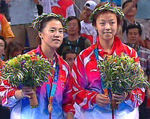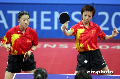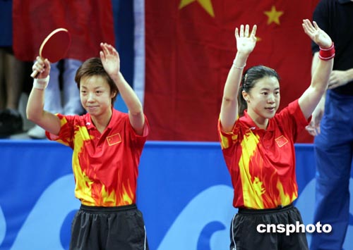 中新社雅典八月二十日電 (記者 宋方燦)千呼萬(wàn)喚之后,中國(guó)乒乓球今天終于出現(xiàn)在雅典奧運(yùn)會(huì)決賽場(chǎng)上。在眾多前來助威的中國(guó)球迷的助威聲中,王楠和張怡寧不負(fù)眾望,以四比零擊敗韓國(guó)選手李恩實(shí)/石恩美,奪取了中國(guó)乒乓球隊(duì)本屆比賽的第一枚金牌。