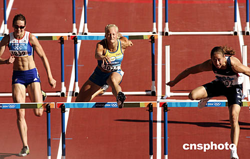 圖為在當(dāng)?shù)貢r(shí)間8月20日舉行的女子七項(xiàng)全能100米欄比賽中,選手們的出色表現(xiàn)。