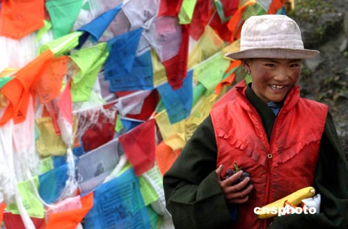 八月下旬,在四川省甘孜州海拔四千三百米的折多山上,一名藏族小姑娘和游客合影后得到新鮮水果作為回報。甘孜藏族自治州成立于一九五零年,是中國第一個專區(qū)級民族自治州。中新社記者:廖文靜