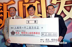 八月二十一日,成龍、楊受成公益慈善基金在北京人民大會(huì)堂成立。國(guó)際著名影星成龍和香港英皇集團(tuán)主席楊受成捐助一千二百萬(wàn)元人民幣為創(chuàng)始基金,用于中國(guó)老人、婦女、兒童、及貧困人員的公益慈善事業(yè)。中新社記者:史利