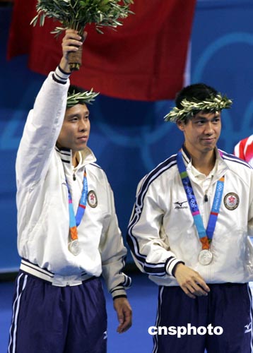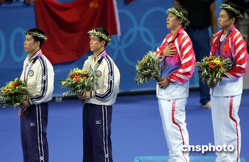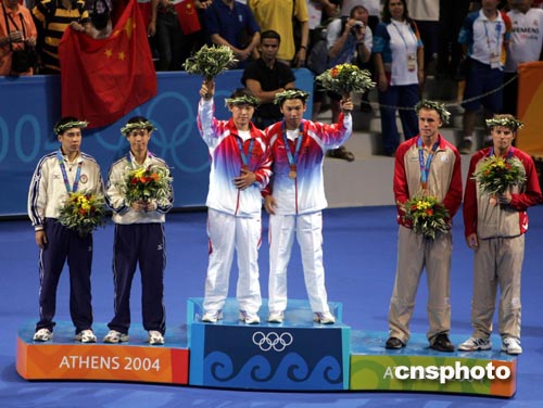 雅典當?shù)貢r間8月21日下午,中國乒乓球選手馬琳、陳玘在男雙決賽中以4比2戰(zhàn)勝香港選手李靜、高禮澤,獲得本屆奧運會男子雙打冠軍。中新社記者:任晨鳴