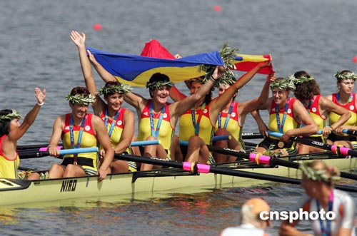 當(dāng)?shù)貢r間八月二十二日,羅馬尼亞隊(duì)獲得雅典奧運(yùn)女子八人單槳有舵手賽艇比賽金牌。中新社記者:毛建軍