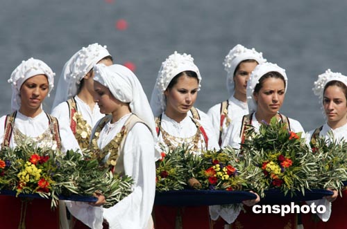 當?shù)貢r間八月二十二日,身著民族服裝的頒獎女郎在雅典奧運賽艇賽場。中新社記者:毛建軍