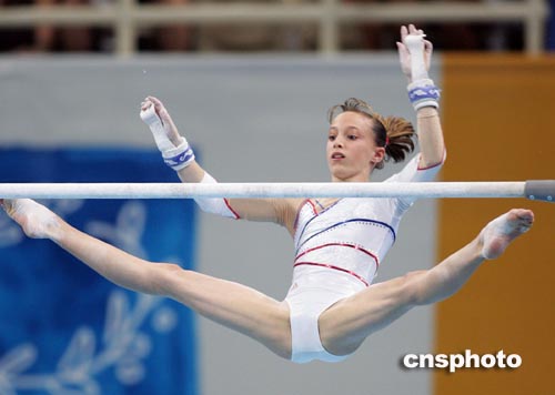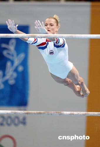 最有希望在高低杠項(xiàng)目中奪取一枚雅典奧運(yùn)金牌的俄羅斯“冰美人”霍爾金娜,今天決賽前半程的發(fā)揮非常出色,其動(dòng)作連接編排巧妙,極具觀賞性。但遺憾的是,她在做一個(gè)杠上倒立轉(zhuǎn)身動(dòng)作時(shí),反手沒有抓住器械,只得下杠后再重新上器械完成后面的動(dòng)作,是八人中唯一出現(xiàn)較大失誤的選手。