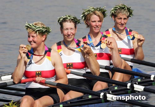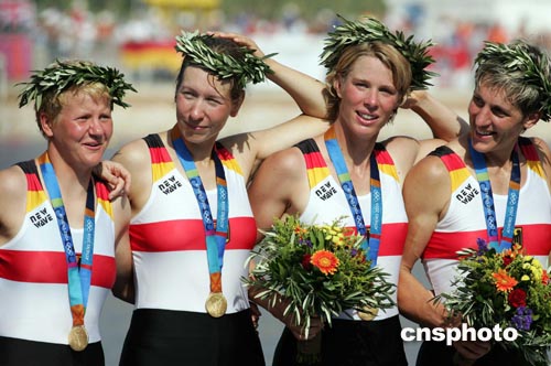 當?shù)貢r間八月二十二日,德國隊在雅典奧運女子四人雙槳賽艇比賽中獲得冠軍。中新社記者:毛建軍