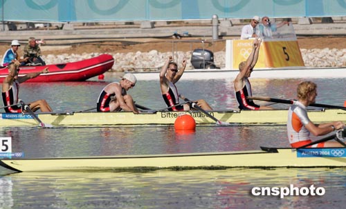 當?shù)貢r間八月二十二日,丹麥選手獲得雅典奧運男子四人單槳賽艇比賽冠軍。中新社記者:毛建軍