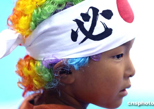 當?shù)貢r間8月22日舉行的女子72公斤級摔交比賽場邊,一個打扮引人注目的小孩在為自己國家的運動員們加油。