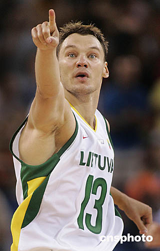 圖為立陶宛隊員賈斯科維奇烏斯(Sarunas Jasikevicius)在投入三分球后指向他的球迷的鏡頭。