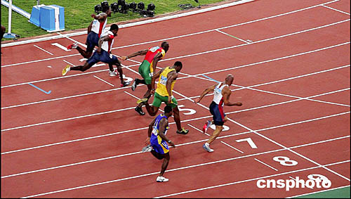 圖為在當(dāng)?shù)貢r間8月22日舉行的男子100米“飛人”大戰(zhàn)中,選手們最后沖刺的鏡頭。