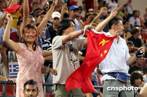當(dāng)?shù)貢r(shí)間8月23日下午,中國(guó)男籃在雅典奧運(yùn)會(huì)小組賽最后一場(chǎng)比賽中以67比66險(xiǎn)勝世界冠軍塞黑隊(duì),闖入前八名。圖為到場(chǎng)觀戰(zhàn)的中國(guó)球迷欣喜異常。中新社記者:任晨鳴