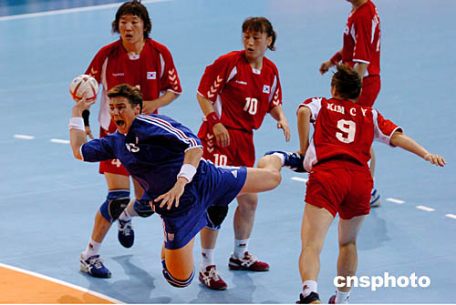 圖為在當(dāng)?shù)貢r間8月23日舉行的女子手球比賽中,法國隊的Isabelle Wendling射門的鏡頭