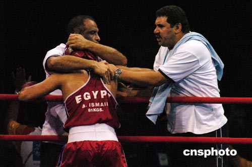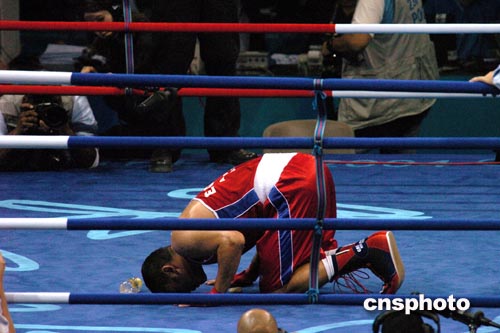 雅典時間八月二十四日,在奧運拳擊四分之一決賽中,埃及選手艾哈邁德?lián)魝ED選手后,因醫(yī)生決定中止比賽而宣告獲勝,艾哈邁德跪地向在場觀眾道歉。作者:陳佳
