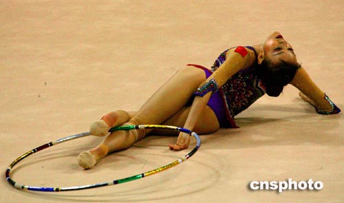 2002年釜山亞運會團體及個人全能冠軍鐘玲,當地時間24日參加藝術體操賽前排練,她將代表中國隊出戰(zhàn)雅典奧運會藝術體操個人全能比賽。中新社記者:王瑤