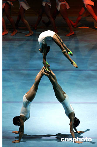 圖為在當(dāng)?shù)貢r(shí)間8月24的體操展覽館里孩子們的精彩表演。