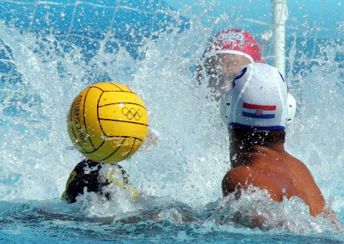 當地時間8月25日上午,雅典奧運會男子水球比賽進入白熱化階段,非洲冠軍埃及隊(黑帽)雖然竭盡全力防守和進攻,但是由于實力差距較大而以1比12的懸殊比分負于克羅地亞隊。比賽中,一名埃及隊員在對方門前頭頂運球進攻。作者:任晨鳴