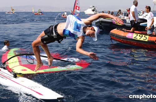 在當?shù)貢r間8月25日進行的女子帆船帆板米斯特拉級比賽中,法國選手馬萊特奪取金牌。