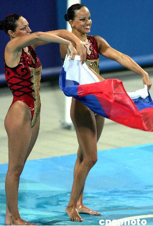 當(dāng)?shù)貢r(shí)間8月25日晚,在雅典奧運(yùn)會(huì)花樣游泳決賽中,俄羅斯選手以完美的表演和極具感染力的藝術(shù)氣質(zhì)毫無(wú)爭(zhēng)議地獲得冠軍,登上奧運(yùn)會(huì)最高領(lǐng)獎(jiǎng)臺(tái)。中新社記者:任晨鳴