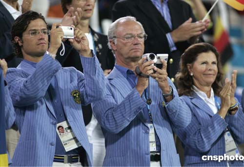 在當?shù)貢r間24日舉行的馬術障礙賽團體賽頒獎典禮上,瑞典國王Carl Gustav,王后Silvia和菲利普王子用微型攝像機拍攝頒獎的場面。