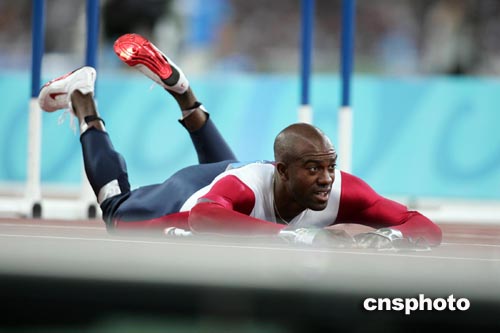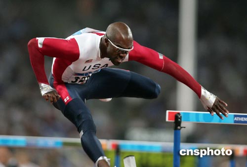 當(dāng)?shù)貢r間八月二十五日晚,在雅典奧運會田徑男子一百一十米跨欄第二輪比賽中,美國名將約翰遜意外踩欄跌倒出局。中新社記者:毛建軍