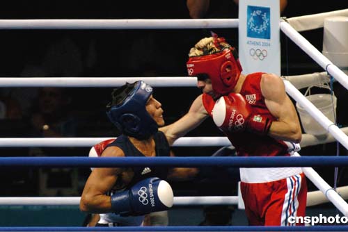 圖為當(dāng)?shù)貢r(shí)間25日進(jìn)行的拳擊四分之一決賽中,法國選手Jerome Thomas力拼對手的場面。