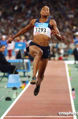 圖為當(dāng)?shù)貢r間25日,美國著名運動員瓊斯在跳遠(yuǎn)比賽資格賽中的表現(xiàn)。
