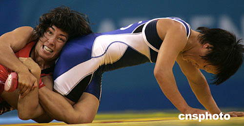 圖為在美國(guó)選手Patricia Miranda和俄羅斯選手battles Lorisa Oorzhak在女子48公斤級(jí)摔交比賽中的鏡頭。