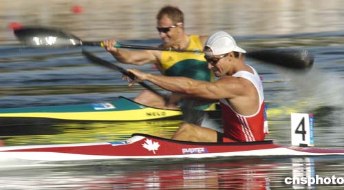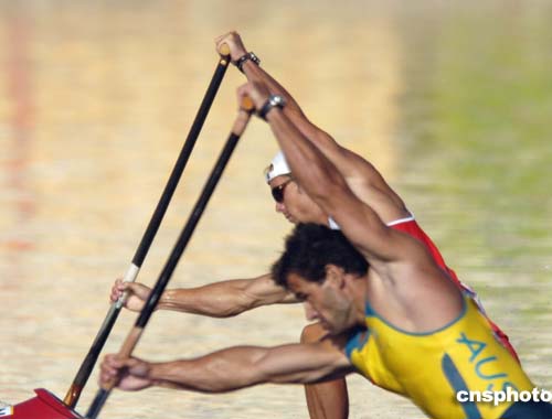 圖為當?shù)貢r間25日舉行的男子皮劃艇單人1500米半決賽中,RICHARD DALTON和MARTIN MARINOV力拼對手的場景。最終Dalton因比MARINOV快半秒而獲得了第三名和一個決賽資格。