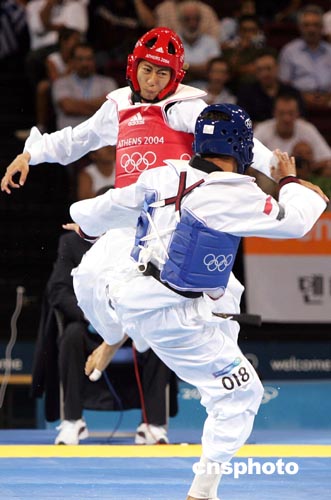 當(dāng)?shù)貢r(shí)間八月二十六日下午,在雅典奧運(yùn)會(huì)男子五十八公斤級跆拳道比賽中,臺北選手朱木炎戰(zhàn)勝埃及選手殺入決賽。中新社記者:毛建軍