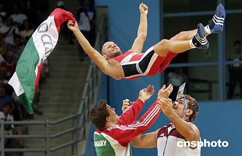 圖為匈牙利選手毛約羅什(Istvan Majoros)在雅典奧運(yùn)會(huì)摔跤男子55公斤級(jí)決賽中奪冠后慶祝的場(chǎng)面。