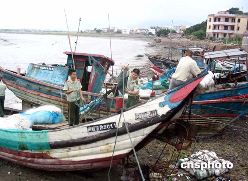 今年第18號臺風(fēng)“艾利”8月25日下午16:30在福建省福清市高山鎮(zhèn)登陸后,正在一線抗臺風(fēng)的福清邊防官兵迅速轉(zhuǎn)入緊急救災(zāi),為群眾挽回經(jīng)濟(jì)損失200多萬元人民幣,確保了省委省政府提出的不死人、少損失的要求,受到當(dāng)局和群眾的一致好評。圖為橋尾邊防派出所官兵協(xié)助當(dāng)?shù)厝罕娂庸虧O船。作者:朱明海