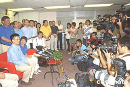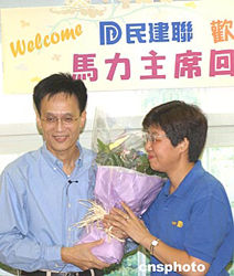 民建聯(lián)主席馬力早時在內(nèi)地接受切除結(jié)腸癌手術﹐28日出院返回香港﹐民建聯(lián)中常委在總部設歡迎會﹐歡迎馬力主席手術成功返港﹐蔡素玉向馬力送花。中新社記者:趙振清