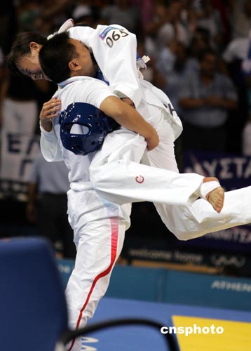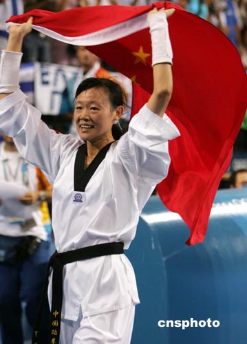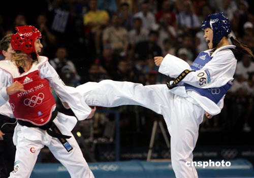 當(dāng)?shù)貢r間8月28日晚,在雅典奧運(yùn)會跆拳道女子67公斤級決賽中,中國選手羅微擊敗希臘選手獲得冠軍。中新社記者:任晨鳴