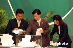澳門特別行政區(qū)第二任行政長官選舉,二十九日在澳門舉行,二百九十九名選舉委員會委員出席選舉會,委員們投票后工作人員在認真點票。作者:梁永強