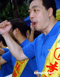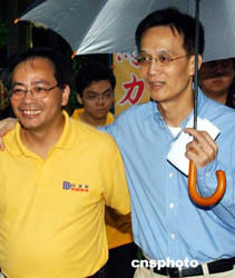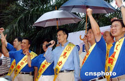 八月二十九日,香港民建聯(lián)舉行2004立法會選舉誓師大會,剛剛手術(shù)出院的民建聯(lián)主席馬力與港島區(qū)候選人一起在誓師大會上,為進軍2004立法會選舉造勢。作者:錢興強