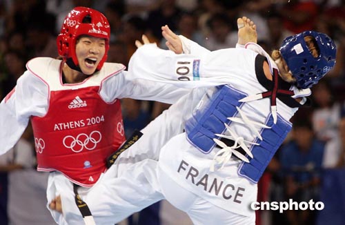 在今晚的奧運(yùn)會(huì)跆拳道女子六十七公斤以上級決賽中,陳中以十二比五戰(zhàn)勝法國選手巴維爾,不僅獲得個(gè)人奧運(yùn)史上的第二枚金牌,而且令中國軍團(tuán)在雅典奧運(yùn)會(huì)上的金牌總數(shù)鎖定在三十二枚,穩(wěn)居金牌榜次席。
