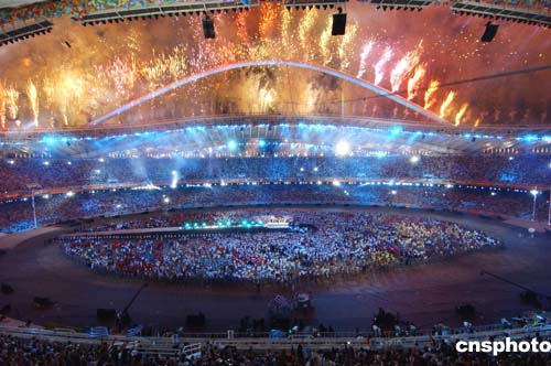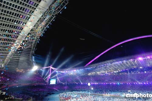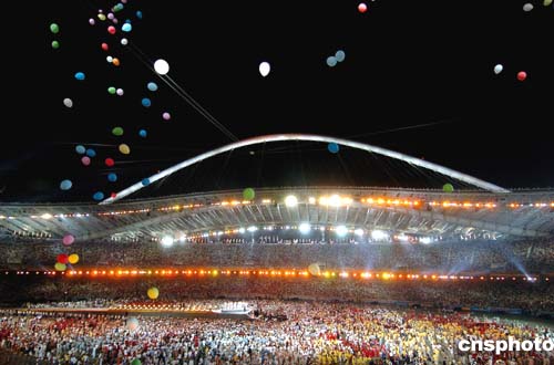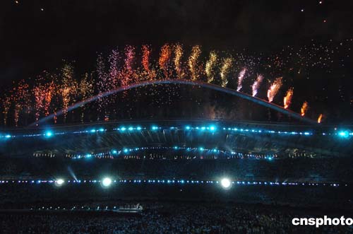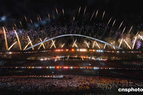 在當(dāng)?shù)貢r(shí)間29日舉行的2004雅典奧運(yùn)會(huì)閉幕式上,焰火在奧林匹克運(yùn)動(dòng)場(chǎng)上空綻放。