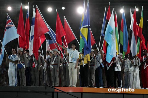 雅典當(dāng)?shù)貢r(shí)間八月二十九日晚,雅典奧運(yùn)會(huì)閉幕式在奧林匹克主體育場(chǎng)隆重舉行,在本屆奧運(yùn)會(huì)奪得男子110米欄金牌的中國飛人作為中國體育代表團(tuán)旗手,步入會(huì)場(chǎng)。中新社記者:毛建軍