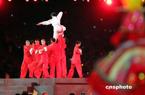 當(dāng)?shù)貢r(shí)間八月二十九日,第二十八屆奧林匹克運(yùn)動(dòng)會(huì)在雅典圓滿結(jié)束。圖為中國(guó)演員在閉幕式上表演節(jié)目。中新社記者:毛建軍